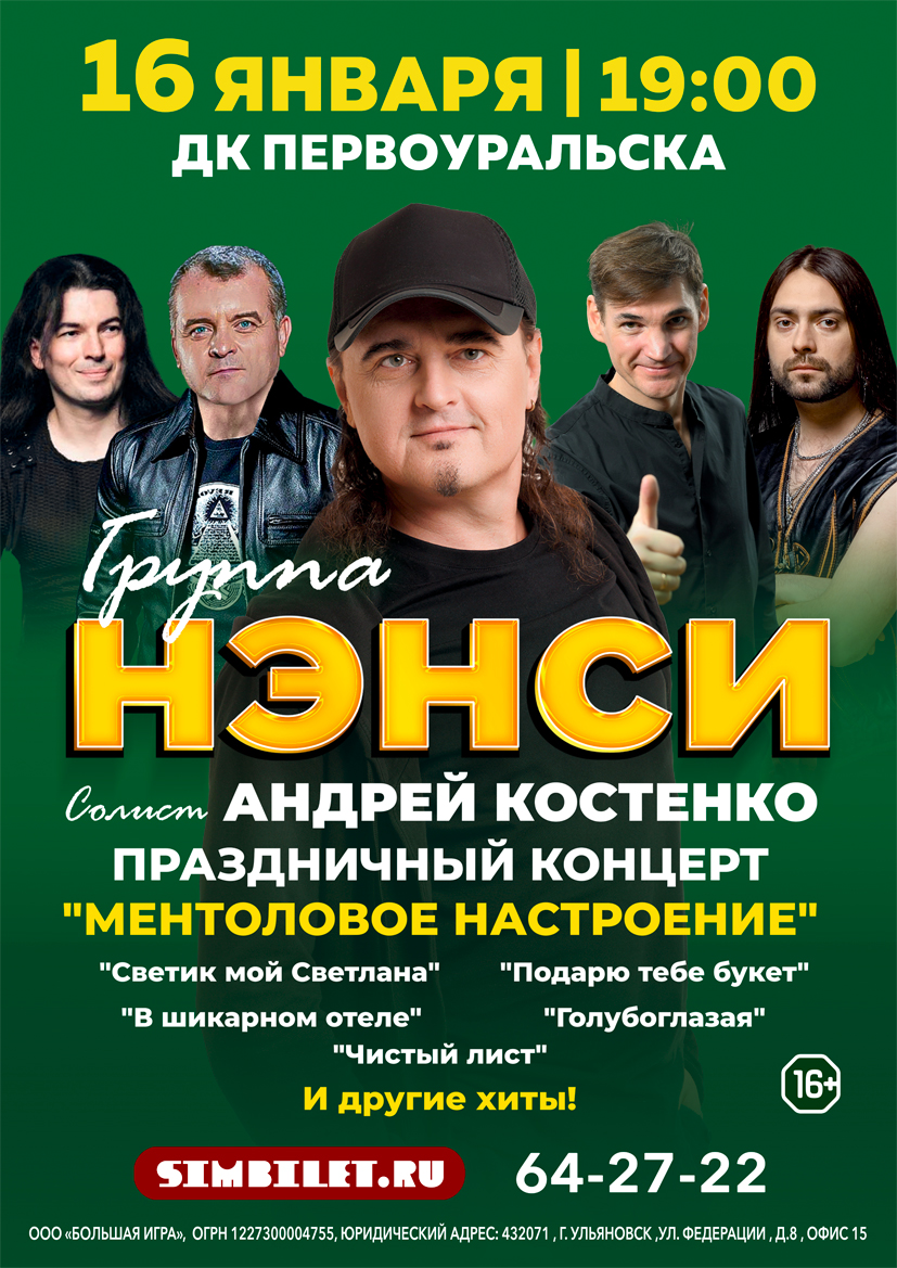 16 января 2026 года в 19:00 на концерте группы «НЭНСИ» вы получите незабываемые впечатления и окунетесь в атмосферу романтики 90-х. Вас ждут любимые хиты и новые душевные композиции в живом исполнении фронтмена Андрея Костенко с музыкальным коллективом! С 2022 года в России официальным солистом группы «НЭНСИ» является только Андрей Костенко.