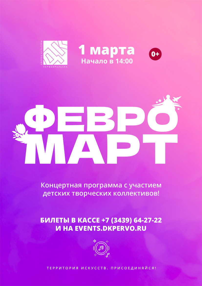 Концертная программа с участием детский творческий коллективов Дворца культуры Первоуральска. Объединяющий концерт День защитников Отечества и Международный женский день.